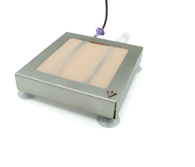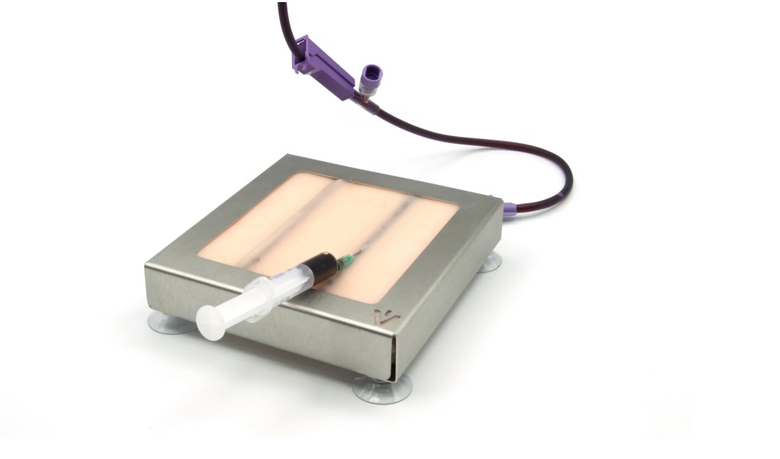 Krevní vak, který není součástí balení a lze dokoupit (obj. č. 003-010-00), má rychloupínací uzávěr a válečkovou svorku pro přesnou kontrolu průtoku krve. Díky přiloženým konektorům lze umělou krev snadno integrovat do všech kompatibilních modelů. Podložka je připravena k okamžitému použití a je opakovaně použitelná.