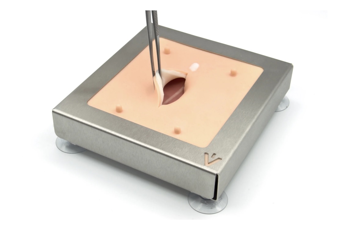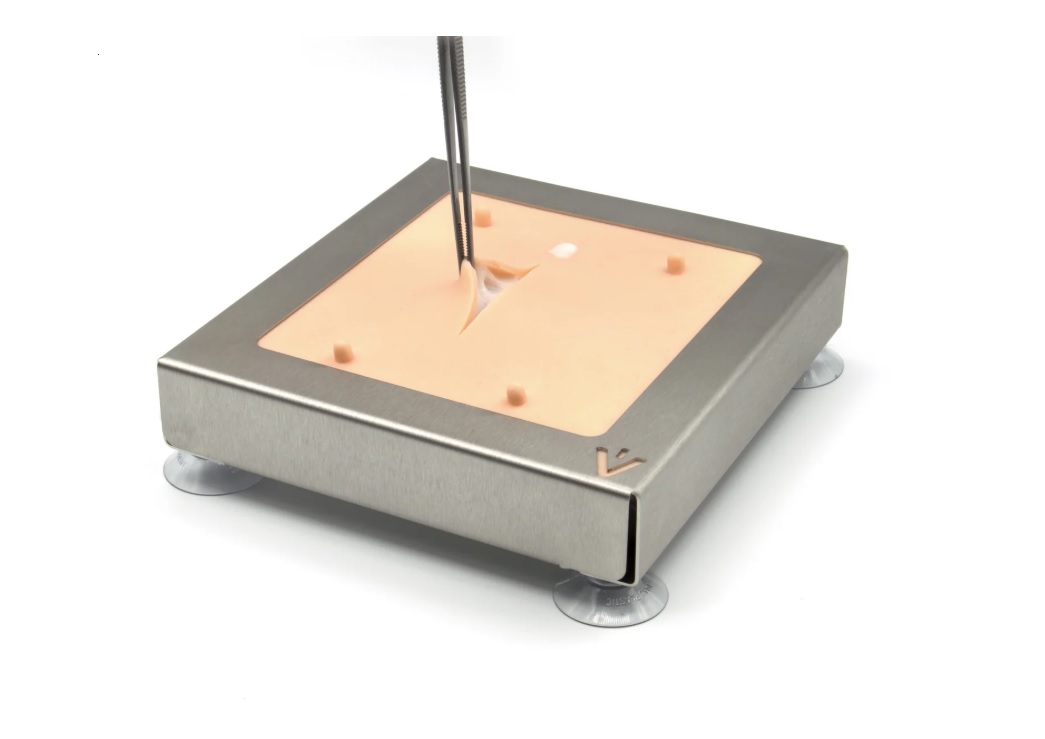 Podložka pro nácvik šití umožňuje nácvik řezu a uzavření podél linea alba u obézních psů nebo koček. Zřetelně vidíme vrstvy tkáně, včetně jasné diferenciace linea alba. Postupný přístup přes břišní stěnu a postupné uzavření každé vrstvy lze procvičovat za realistických podmínek pomocí chirurgických stehů nebo kožních svorek – ideální pro praktický, na praxi zaměřený nácvik.