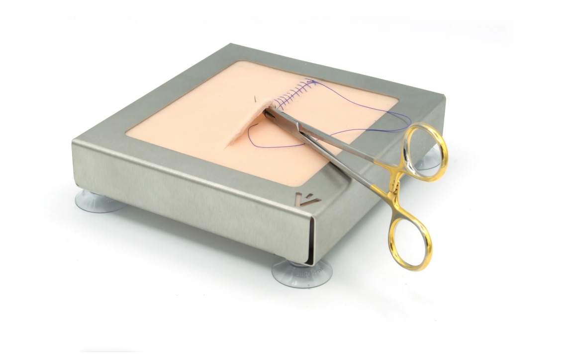 Tato třívrstvá šicí podložka je obzvláště pevná a dokonale napodobuje vlastnosti prasečí kůže. Zvláště silná a odolná pokožka umožňuje realistický nácvik řezů, stehů a technik chirurgických uzlů. Vizuální a texturní vymezení mezi kůží a podkožím navíc poskytuje příležitost pro nácvik nitrokožního šití. Šicí podložky jsou odolné proti roztržení a zachovávají si svůj tvar a strukturu i po opakovaném použití. Praktický držák podložek (S) lze použít k upevnění podložek ve vertikální nebo horizontální poloze podle potřeby.