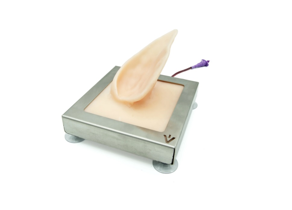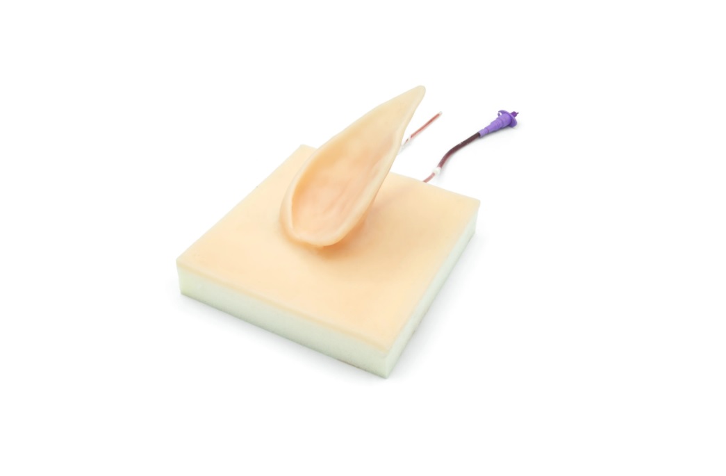 Flexibilní model ucha prasete s integrovanou ušní žílou umožňuje realistický nácvik intravenózních injekcí, odběrů krve a zavedení žilního katétru – ideální příprava na zákroky na živých zvířatech.