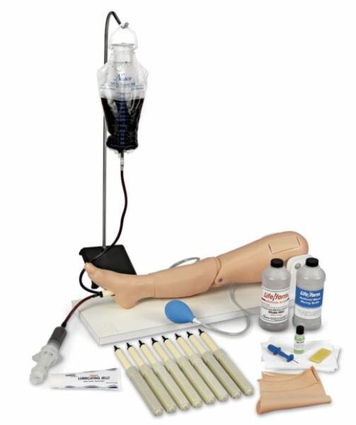 Model dolní končetiny pro nácvik podávání intraoseálních infúzí/femorálním přístupem je umístěna na stojanu pro použití jako samostatná nácviková jednotka. Vlastnosti pro intraoseální infuzi zahrnují: hmatatelné orientační body zahrnující patellu, holenní kost a tuberositu tibie; vyměnitelné kosti a kůže; tlakový systém umožňující odsávání tekutiny.