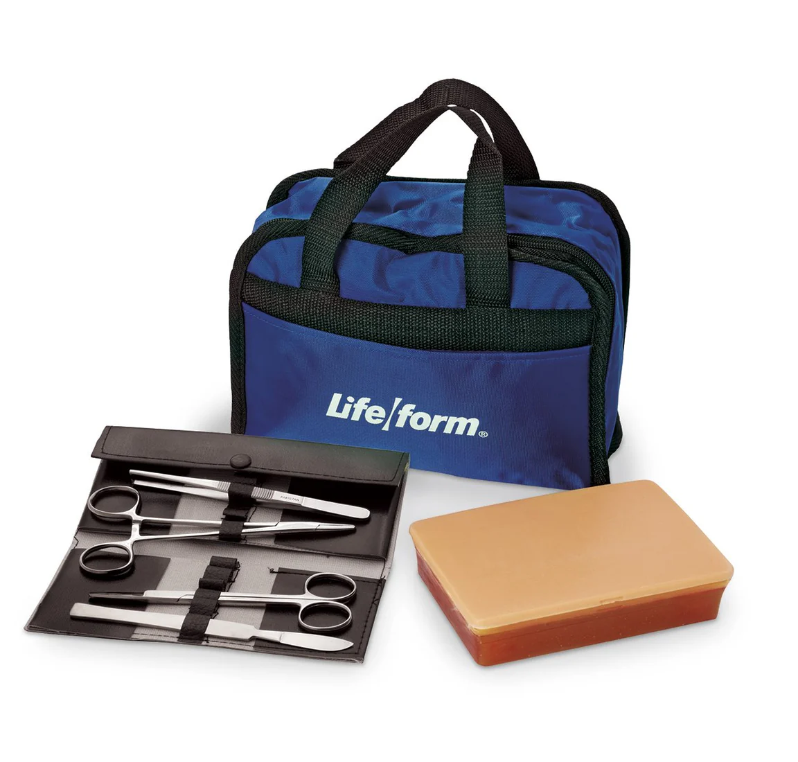 výhodná sada, nabízející nácvik šití všech úrovní, vázání uzlů, umístění svorek, lepidla, subkutánní šití atd., podložka se skládá z epidermis, dermis, fascie, tuku a svalu, sada obsahuje: podložku, držák, tašku, jehlu, nůžky, svorky, skalpel, nylonovou nit a pouzdro na nástroje