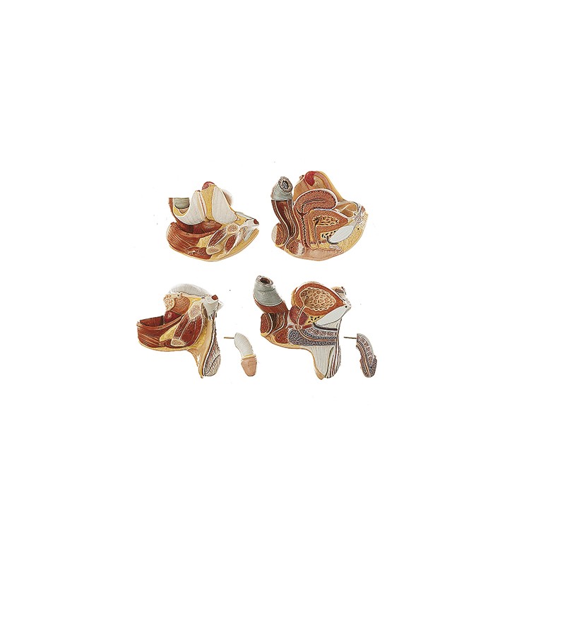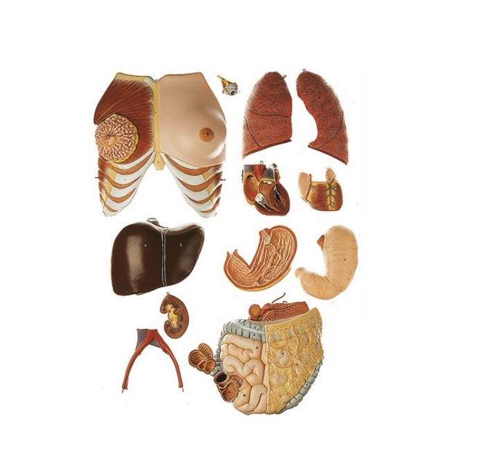 v životní velikosti, vyrobeno ze speciálního materiálu SOMSO-Plast®, model obsahuje tyto části: oko se zrakovým nervem a svaly, ženskou hrudní stěnu, odnímatelnou polovinu plíce (2), srdce (2), játra, žaludek (2), tenké a tlusté střevo s dvanácterníkem a slinivkou břišní, otevřené slepé střevo, pravou ledvinu, pánevní cévy, ženské (2) a mužské (4) reprodukční orgány, na podstavci, výška 92 cm (torzo 88 cm)