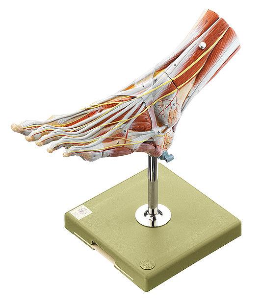 v životní velikosti, vyrobeno ze speciálního materiálu SOMSO-Plast®, znázorňující síť nervů a cév i vazy, odnímatelné vrstvy svalů na chodidle, na stojanu