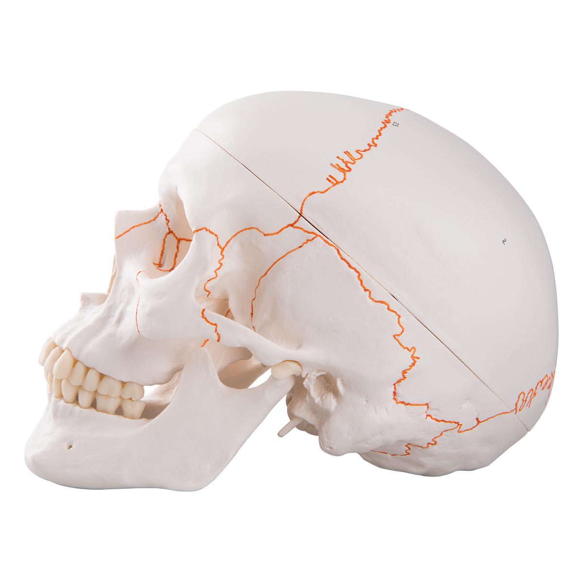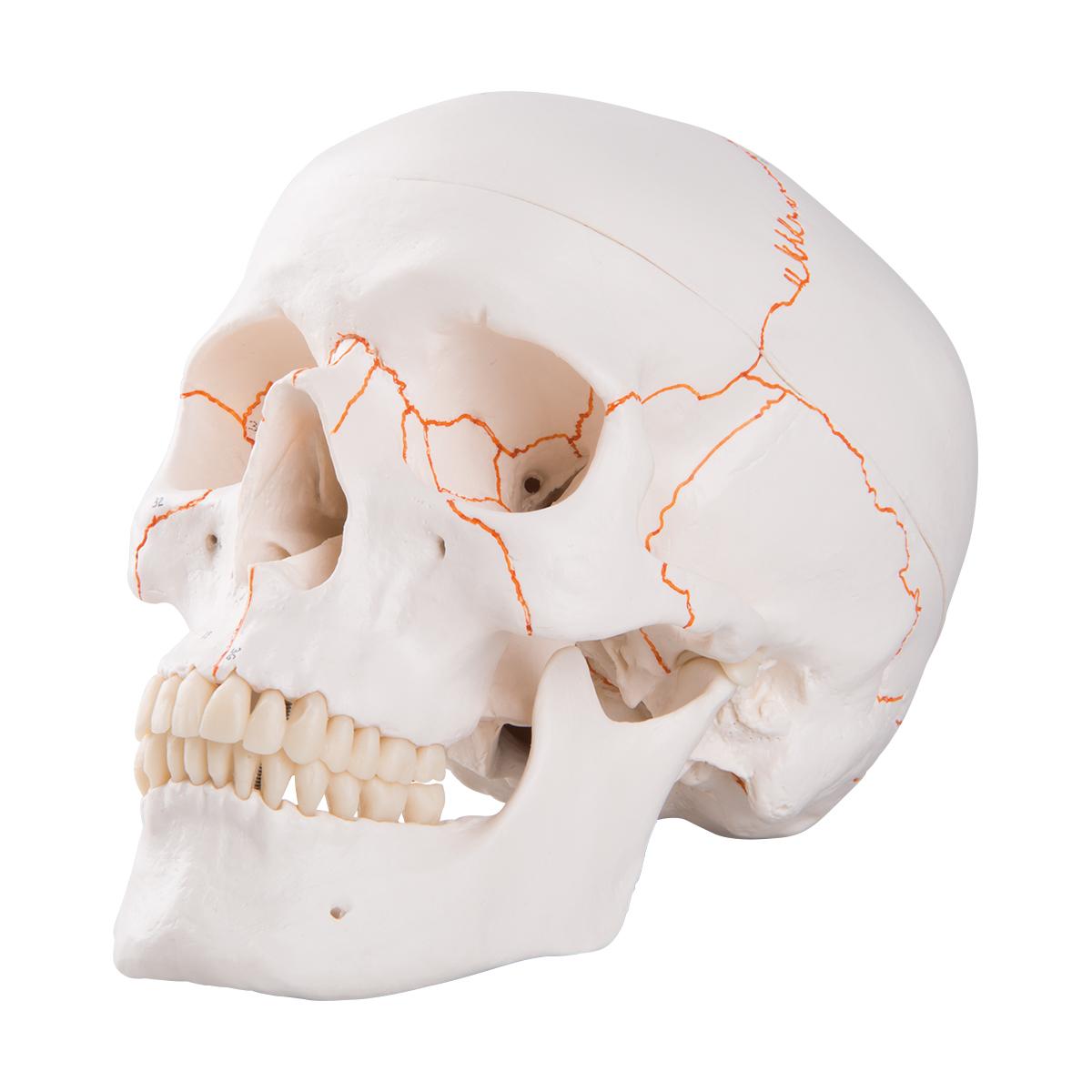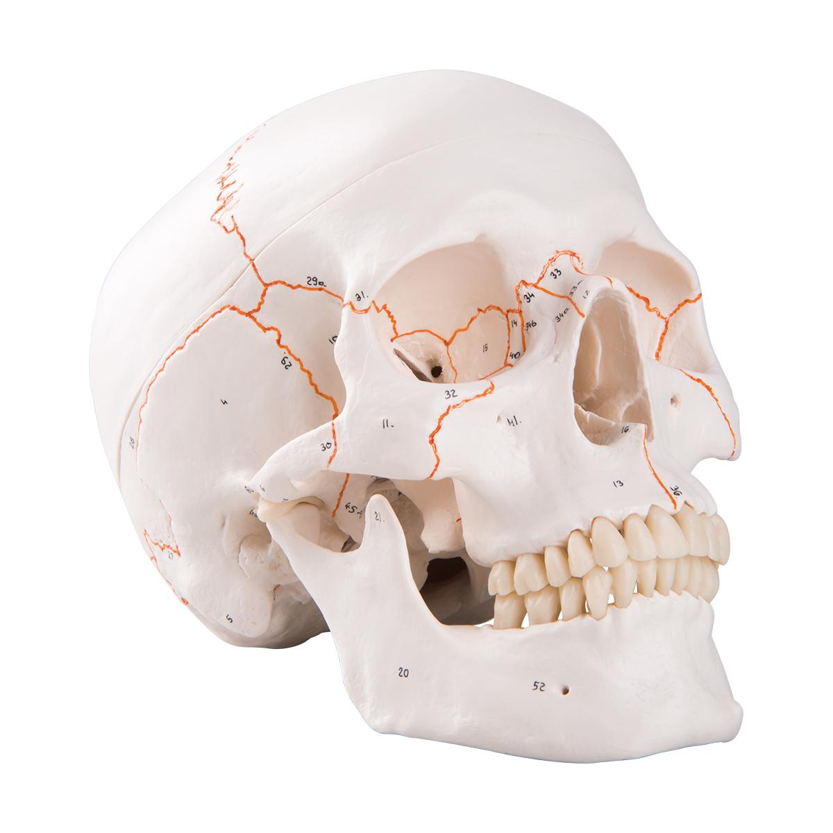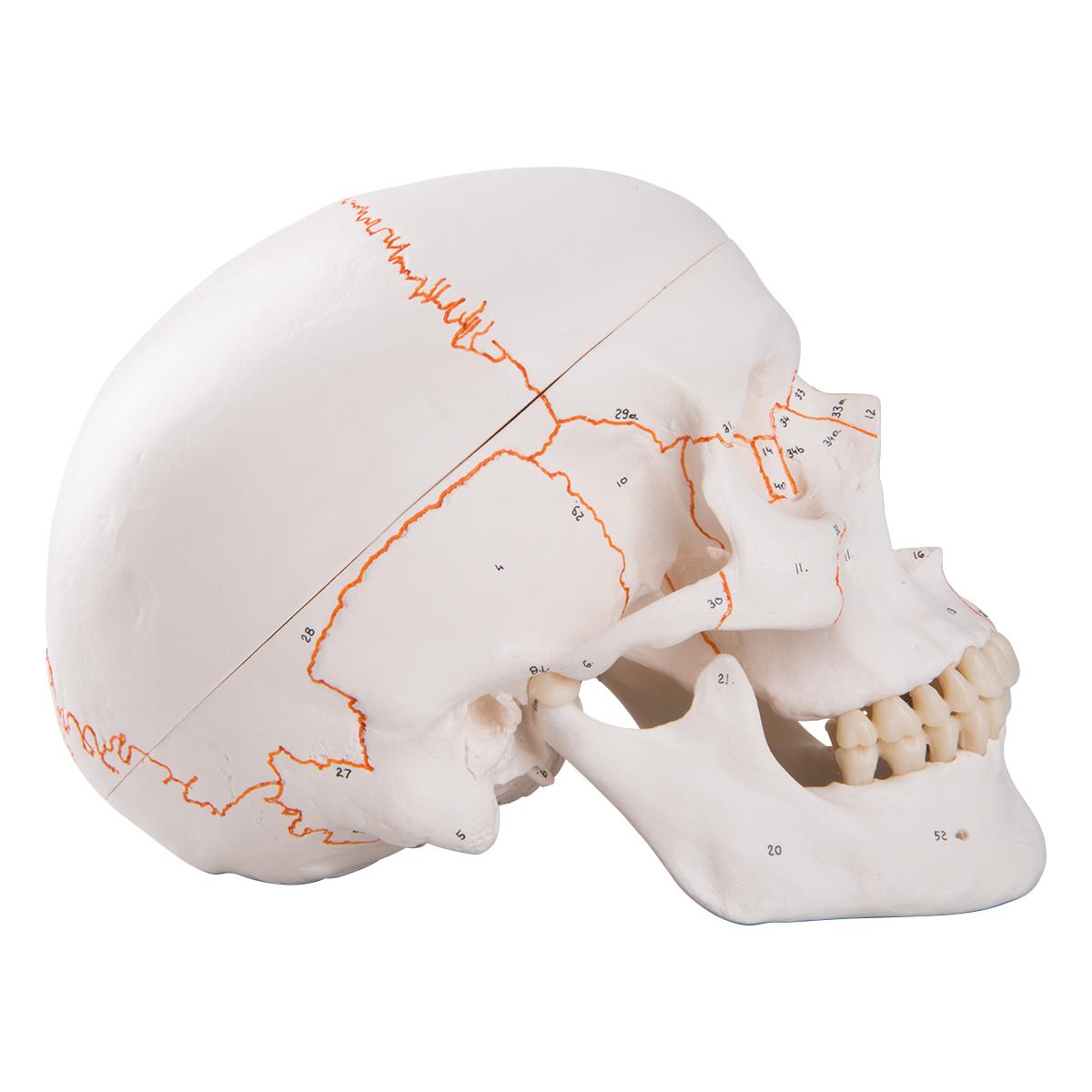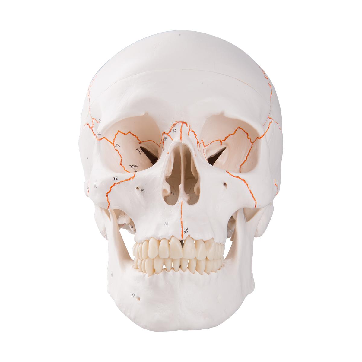 očíslovaný model s barevnými lebečními švy, vyrobeno z odolných materiálů, přesná reprezentace trhlin, otvorů a průduchů, švů atd., rozebíratelné na temeno lebky, spodinu lebeční a spodní čelist, každý zub individuálně odlit, lze kombinovat s modelem mozku (AM110-0207)