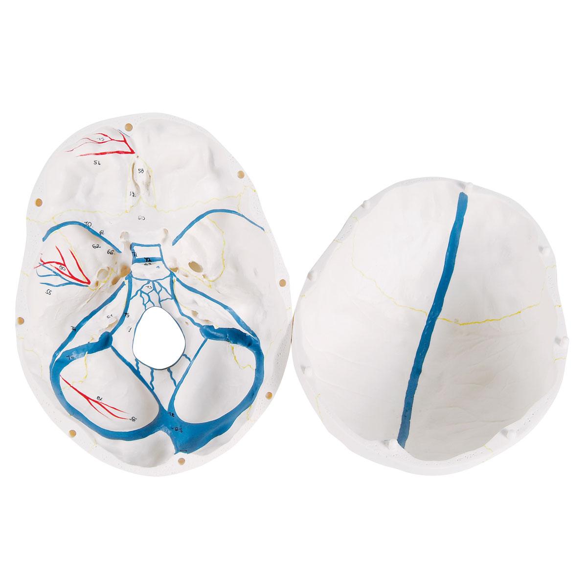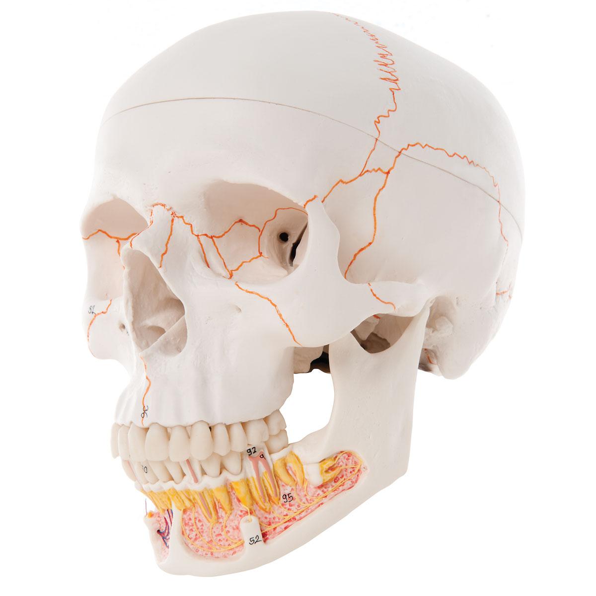 odhalené kořeny spodních zubů s cévami a nervy, barevné lebeční švy, vyrobeno z odolných materiálů, přesná reprezentace trhlin, otvorů a průduchů, švů atd., rozebíratelné na temeno lebky, spodinu lebeční a spodní čelist, lze kombinovat s modelem mozku (AM110-0207)