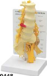 model obratlů L1-L5 a kosti křížové v životní velikosti, znázorněny bederní nervy, na pravé straně se sakrálním nervem a sedací větve s vyhřezlou ploténkou, na stojanu