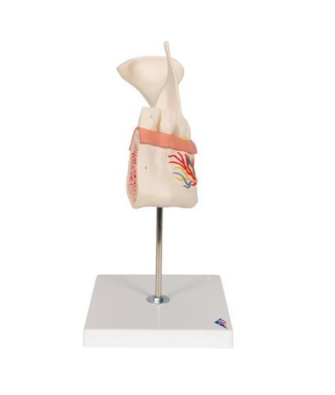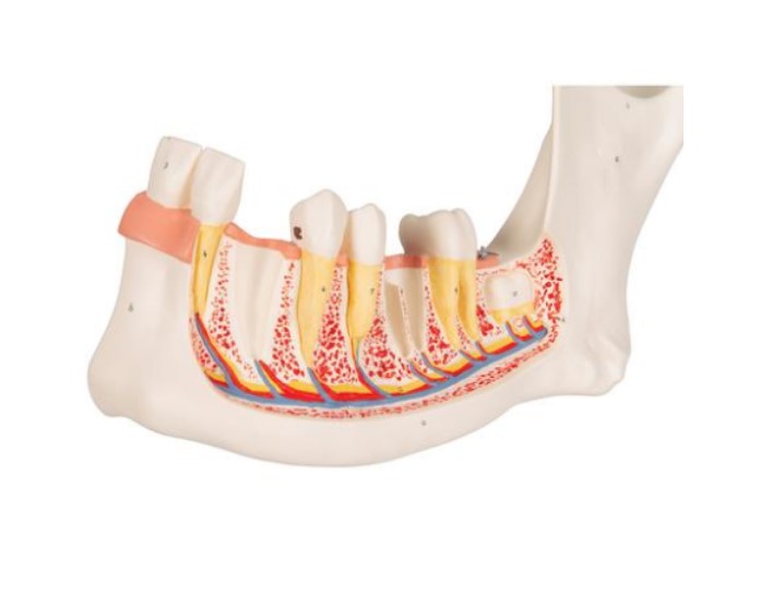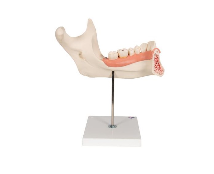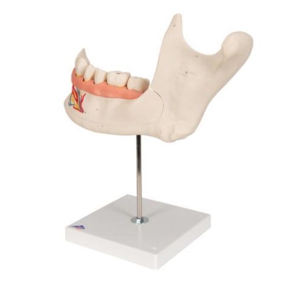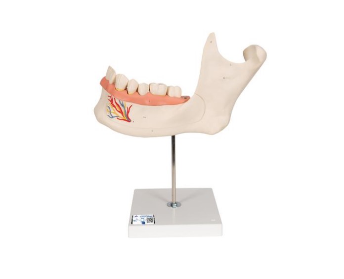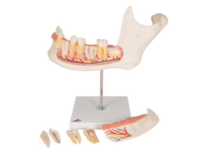 levá dolní čelist mladé osoby, z poloviny dolní čelisti je možné sejmout část kosti pro odhalení zubních kořenů, spongiózy, cév a nervů, vyjímatelný podélně dělený špičák i stolička, na stojanu