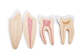 modely 10x zvětšeny, špičák a stolička je rozdělena na dvě poloviny pro odhalení vnitřních struktur
