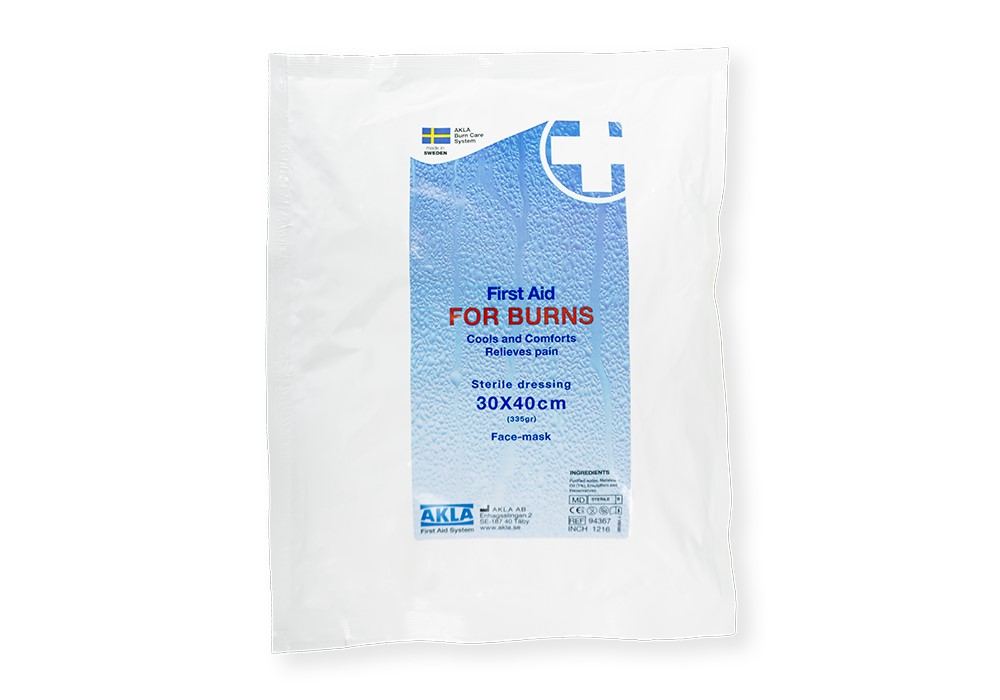 Protipopáleninové sterilní krytí, které je uzpůsobeno pro popáleniny na obličeji s otvory pro oči, nos a ústa.